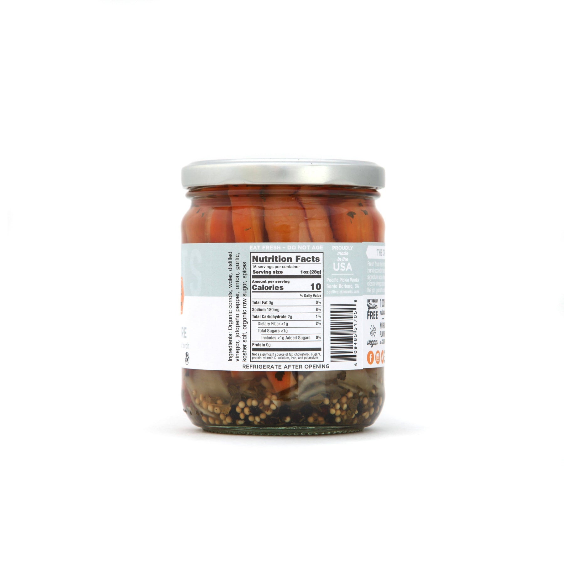 Ingredients: organic carrots, water, organic distilled vinegar, jalapeño pepper, onion, garlic, sea salt, organic raw sugar, spices.