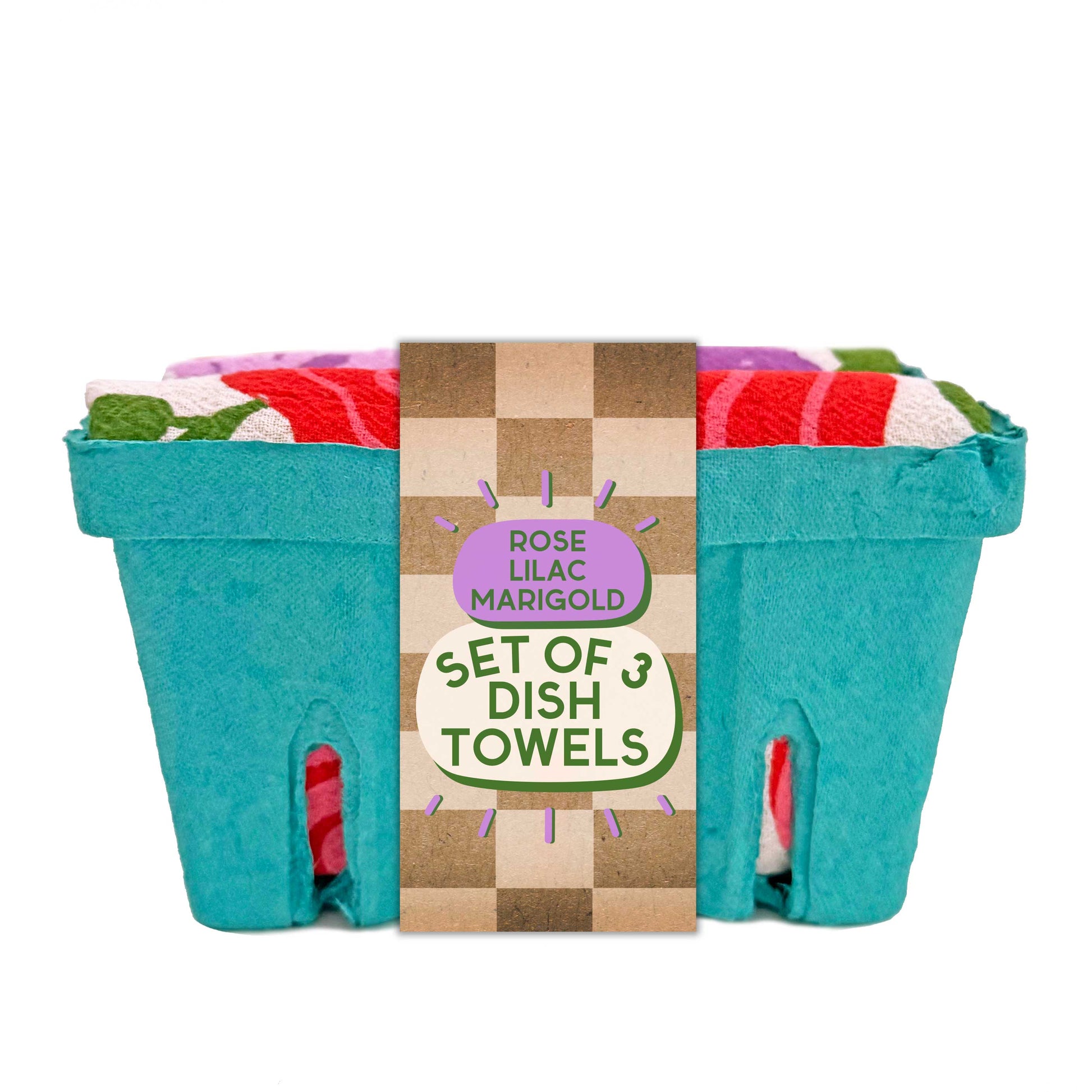 Pretty, practical, and gift-ready! This charming dish towel set comes packaged in a produce-style container with a clean branded belly band, making it easy to showcase the full designs. Inside are three of our signature 100% cotton, unbleached dish towels, each screen-printed with eco-friendly, water-based inks in floral-inspired prints: Rose, Lilac, and Marigold.