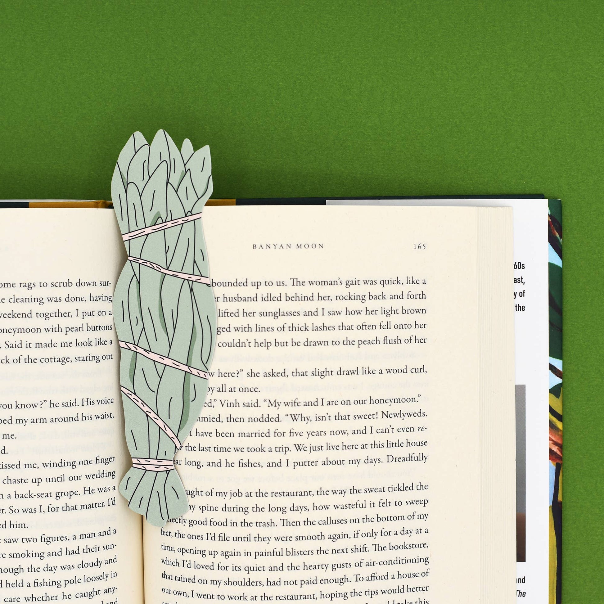 Sage Bookmark is attached with a single glue dot that holds until peeled off. Removal of dot from bookmark leaves no sticky residue. Bookmarks are printed double-sided with UV inks, on a sturdy 24pt Cover paper stock.