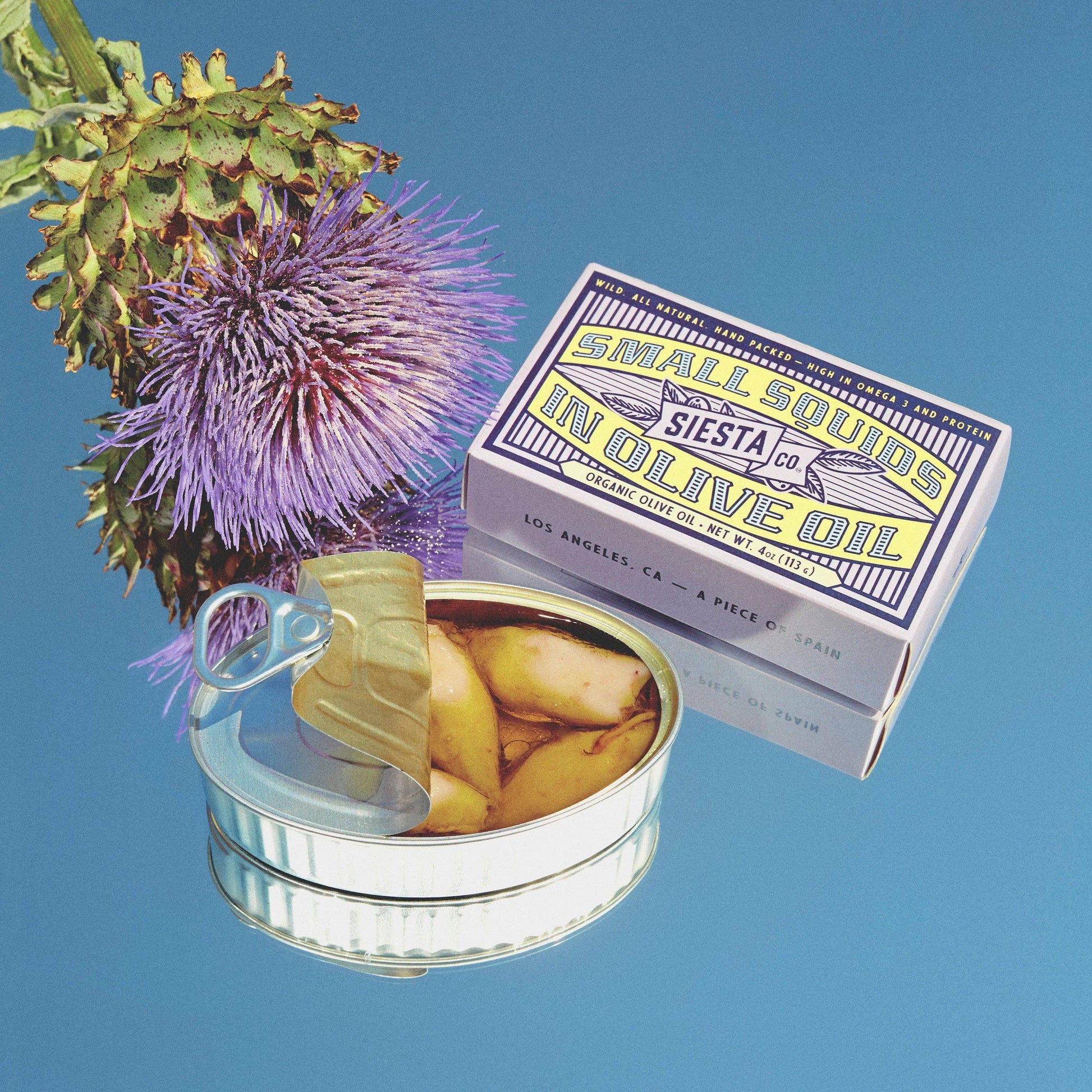 Siesta Co. small squids packed in extra virgin organic olive oil. One of the traditional gastronomic jewels from the region of Galicia, Spain, these wild small squids -or chipirones- are all natural and sustainably wild-caught, then packed individually by hand in delicious organic olive oil with a touch of sea salt. With their rich flavor preserved, these squids make for a wonderfully authentic Spanish dining experience. Garnish them in sea salt, cook them into rice or pasta, or toss them on toasted bread to enjoy the flavors of the sea. Ingredients: Squid, organic extra virgin olive oil, sea salt
