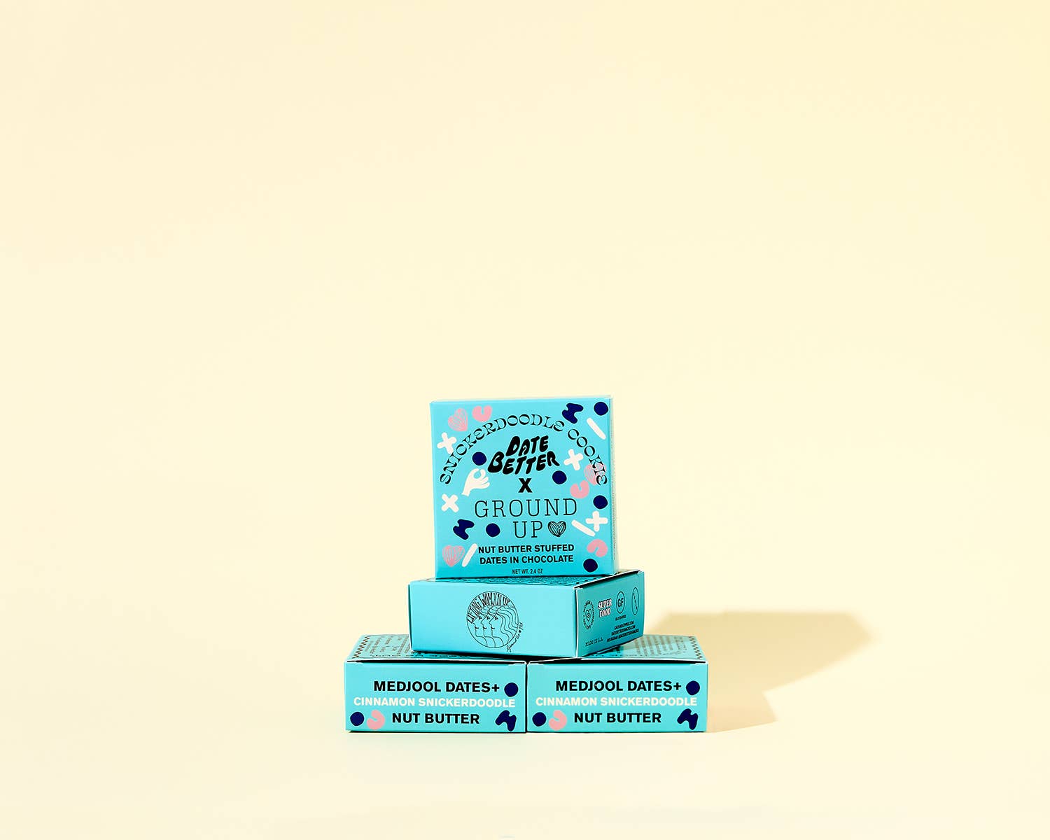 Cozy nostalgia wrapped in dark chocolate. Made in collaboration with our friends at Ground Up, this seasonal favorite features soft Medjool dates stuffed with their iconic Cinnamon Snickerdoodle Nut Butter, dotted with cinnamon-dusted almond pieces, then coated in silky 85% organic, fair trade dark chocolate — completely soy-free and free from emulsifiers.