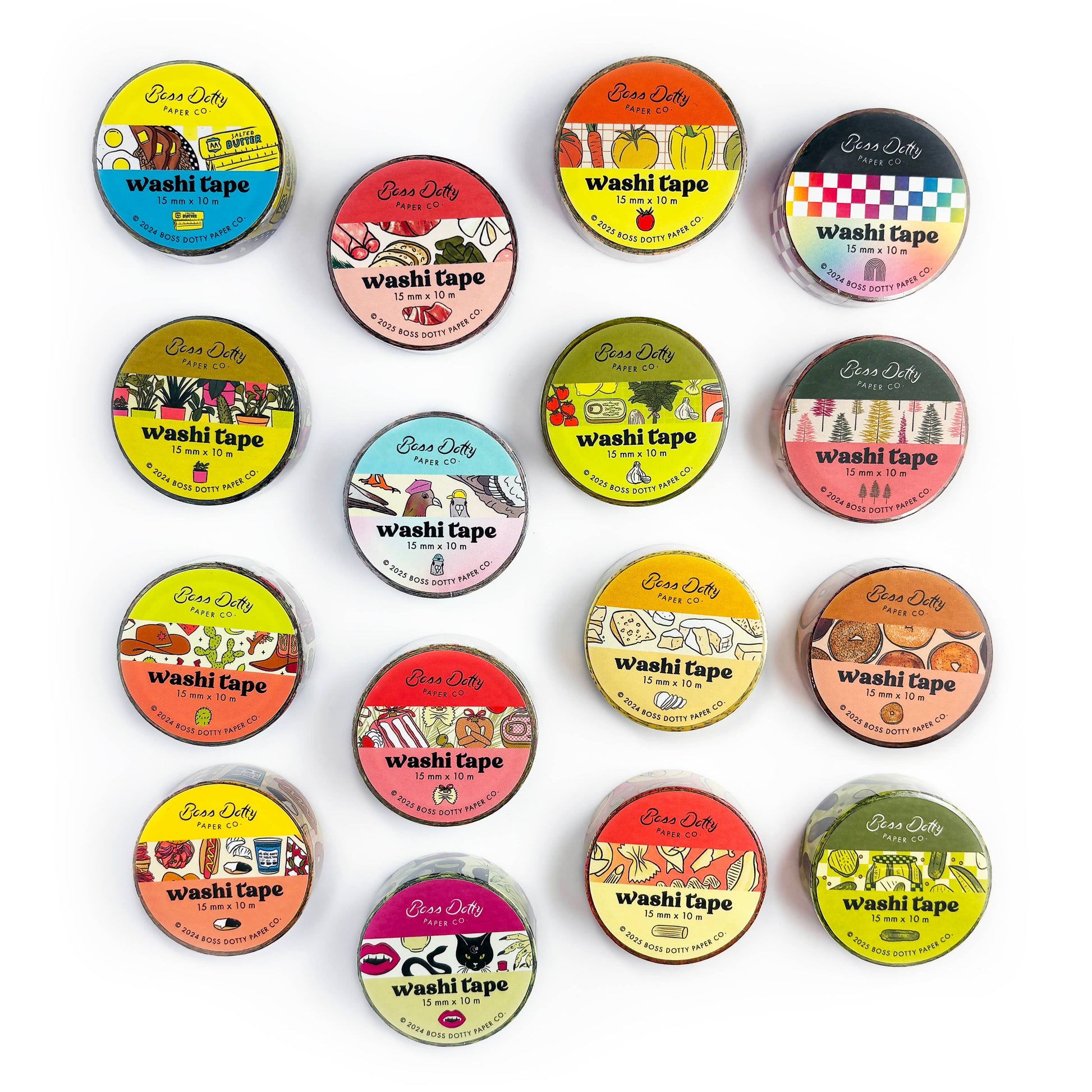 Add a dash of grocery aisle charm to your notebooks, gift wrap, or craft projects with this ultra-colorful washi tape, featuring a parade of illustrated pantry staples from burrata to baguettes. Printed on traditional rice paper, it’s lightweight, removable, and seriously fun to stick just about anywhere.